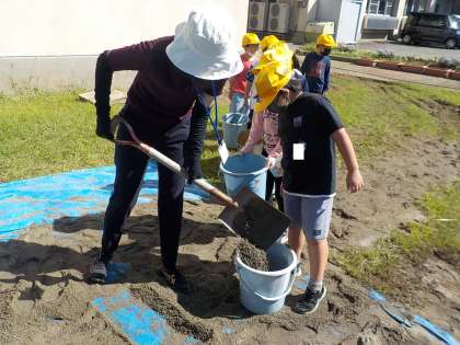 砂場で学習するために、砂場ランドづくりに取り組みました。ペアで協力してバケツで砂を運び、完成しました。