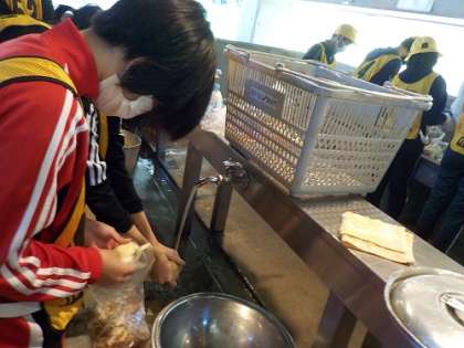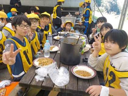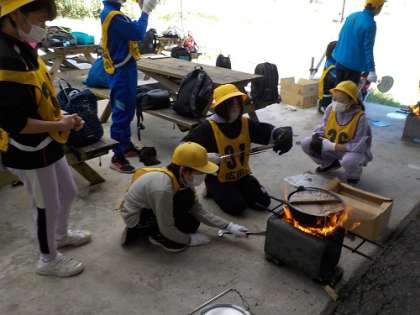 2日目午前は、野外炊さんのカレーライス作りです。「付けた火を消さないように、うちわでゆっくり酸素を送り込むといいよ」「ごはんは、水の量に気を付けよう」「ニンジンやジャガイモは、少し大きめに切ると形がくずれなくておいしく味が出るよ」など、自分たちの経験から仲間と協力して火起こしや食材切りを進めていきました。カレーライスのおいしいにおいが第2炊事棟に立ちこめていました。