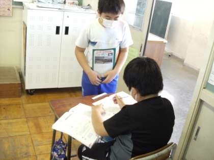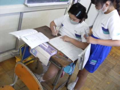 かけ算の筆算の練習に一生懸命取り組んでいます。自分の中で分からないことがあるときは、友達と計算の仕方を確かめ合いながら粘り強く問題に取り組みました。