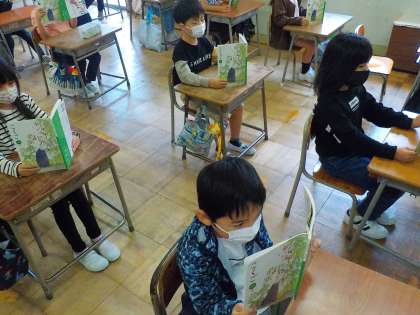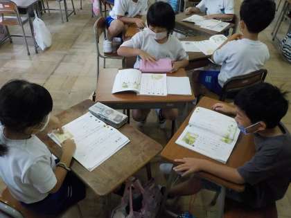 「がまくんは悲しい気持ちになっているから、小さい声でゆっくり音読しよう」「かえるくんが急いでいる様子を伝えるために、早く読もう」など、登場人物の気持ちや様子を文章から読み取り、音読の工夫をしています。グループで役割に分かれて音読するなど、物語を楽しみながら、学習に取り組んでいます。