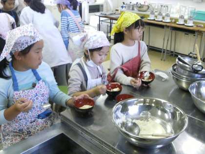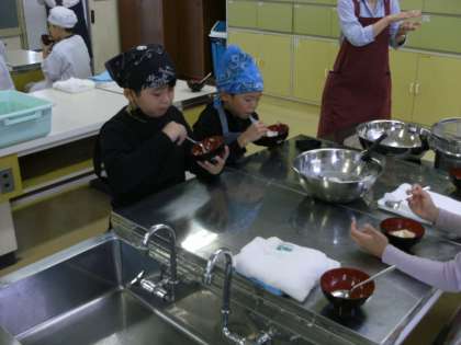 豆腐づくり体験の様子です。前日に水につけていた大豆を調理して、豆腐を作りました。でき上がった豆腐を食べ、「これが本当の豆腐なんだ」「おいしいな」など、自分たちの力で作った豆腐の味に大満足でした。