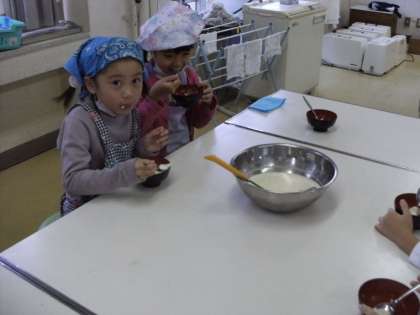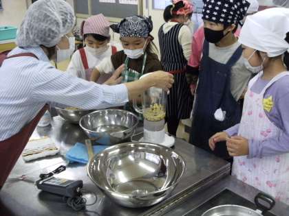 豆腐づくり体験の様子です。豆腐が完成するまで、友達と協力して声を掛け合う姿や班のみんなで笑顔で豆腐を食べる姿が見られました。一つのことを力を合わせて取り組むことで、やり遂げた達成感やみんなと協働する楽しさを感じることができました。
