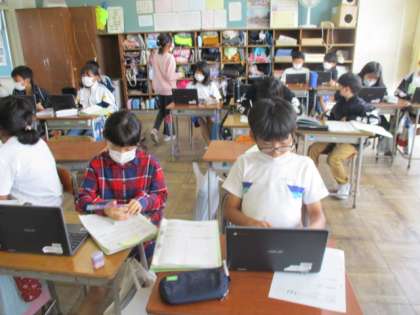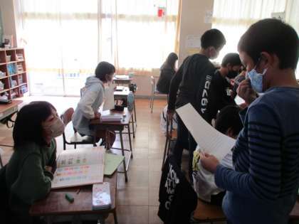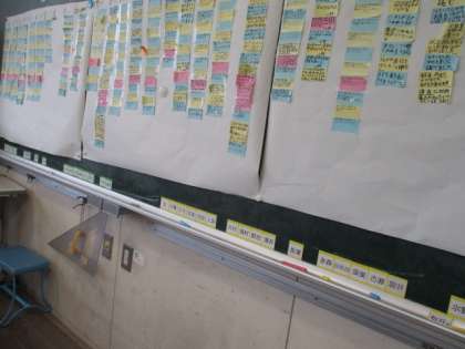 調べる、話し合う、アンケートにまとめるなど、自分のしたい活動に取り組んでいます。振り返ったことを書いたふせん紙も増えてきました。