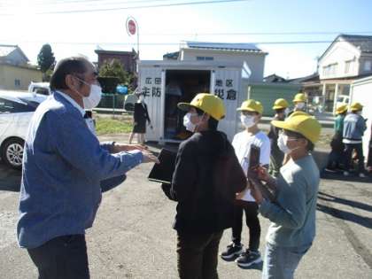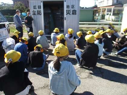 6年生 総合的な学習の時間「広田の地域に向けて、防災の視点で発信しよう、SDGs」 自主防災倉庫の見学