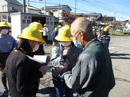 今回は、広田地区センターにお願いをして、自治振興会長さんや防災士の方に来ていただき、自主防災倉庫の中を見学させてもらいました。子供たちは、防災倉庫が設置されている理由や防災倉庫の中に置いてある備品について、緊急時には誰が開けることになっているのか、どうやって中の備品を揃えていくのか、どんな気持ちでやっておられるかなど、たくさんの質問をしながら、防災への疑問を解決しようとしていました。