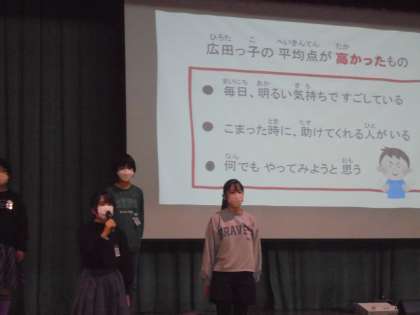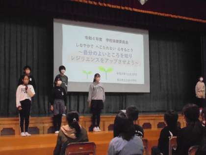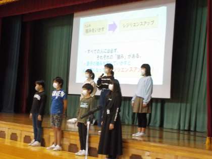 まず、保健委員会の子供たちが、「自分のよいところを知り、レジリエンスをアップさせよう」と調査したことを発表しました。その後、生活人権委員会の子供たちが、「ちくっと」をなくして、「ふわっと」を増やそうということを全校に広める『ふわっとプロジェクト』について発表しました。子供たちは、生き生きと発表していました。