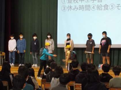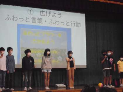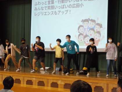 生活人権委員会の子供たちは、「ふわっとフラワー」の取組を推進しています。全校の子供たちが、人に言ってもらった言葉や友達にしてもらってうれしかったことをお花のカードに書いて、体育館渡り廊下に掲示している活動です。それを紹介したり、実際に劇のようにしたりして伝えました。最後には、広田っ子は、「やれば、できる」と力強く締めくくっていました。