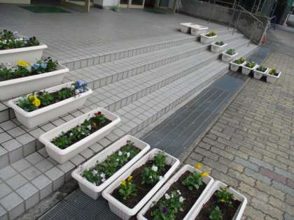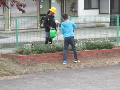 5年生がプランターや花壇に植えた花に、毎朝、水やりをしています。