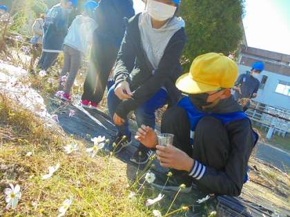 わくわくタイムには、コスモスの種取りをしました。集めた種は手作り封筒に詰め、来年の6年生に引き継ぎます。来年度も、広田っ子がまた春に種を植え、秋にきれいな花を咲かせるでしょう。子供たちは、封筒に「来年度もきれいなコスモスを咲かせてね」「きれいなコスモスを育ててね」とコメントを残しました。来年度のコスモスロードが楽しみです。