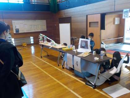 2年生の学び発表は、生活科「作ってあそぼう」の学習で作成したゴムや風などで動くおもちゃの発表と、音楽科で練習した「山のポルカ」の合奏でした。