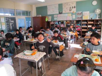 ソフト麺をおいしくいただきました。マスクを外したみんなの笑顔を見ることができる時間です。