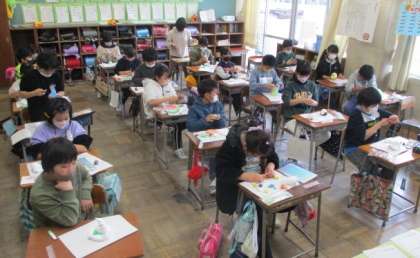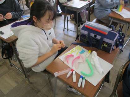 図画工作科「〇〇のお守り」の学習で、紙粘土を使って自分だけのお守りを作りました。丸めたりねじったり、絵の具を練り込んだりして、紙粘土の感触を楽しみながら作品を制作しました。