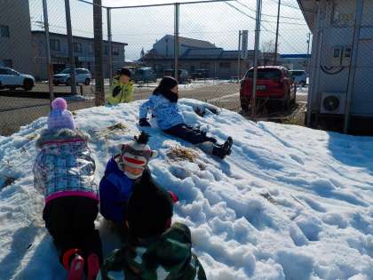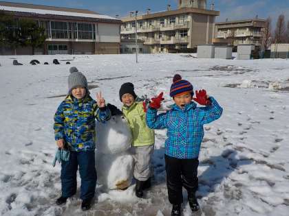 今日はグラウンドに降り積もった雪を使って遊びました。雪だるまを作ったり、山の斜面を滑り台にしたりするなど、それぞれが工夫して遊んでいました。「雪って色々な形にできるから面白いね」「もっともっと雪がたくさん降って欲しいな」と雪に慣れ親しみながら楽しんでいました。