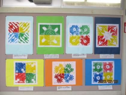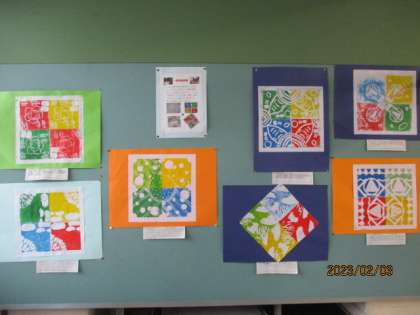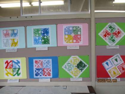 板に塗る色を変えて4回刷ると、このような模様になります。1組の作品です。