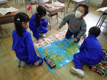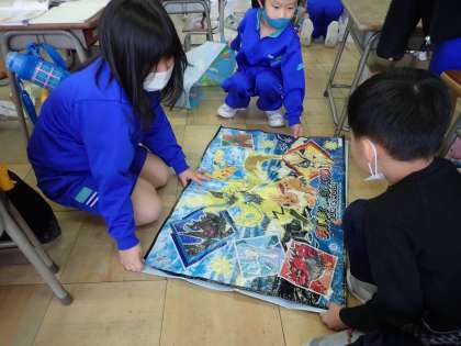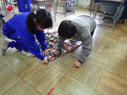 家から持ってきたレジャーシートの広さを比べました。「はしをぴったり合わせよう」と友だちと声をかけ合っていました。