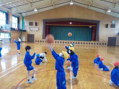 今日は、ボールを頭より高く投げ上げて、キャッチする前に拍手を3回したり、的や相手に向かってボールを投げたりする練習をしました。「わたしは拍手を5回できた」「遠いところからでも100点の的に当たった」と楽しみながら活動していました。今後は、段ボールを積み上げた的に向かってボールを当てるゲームをします。