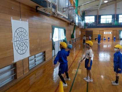 今日は、ボールを頭より高く投げ上げて、キャッチする前に拍手を3回したり、的や相手に向かってボールを投げたりする練習をしました。「わたしは拍手を5回できた」「遠いところからでも100点の的に当たった」と楽しみながら活動していました。今後は、段ボールを積み上げた的に向かってボールを当てるゲームをします。