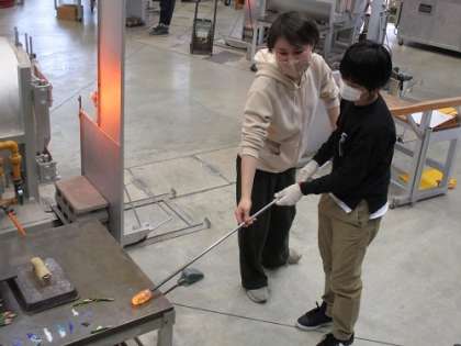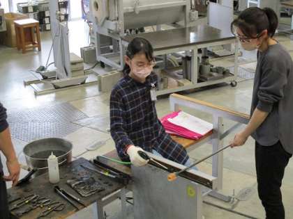 6年1組は、卒業記念制作として富山ガラス工房へペーパーウェイトを作りに行きました。まずはデザイン、「どんな形にしようかな、何層にしてどんな模様を入れようかな」と自分たちで決めました。そして、いよいよガラス制作です。「ガラスが溶けるとこんなにも自由に形を整えられるなんてすてきだな」「マーブル模様や縞模様の入れ方ってこのように入れていくんだ」など、新しい発見をしながら制作していました。