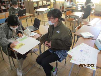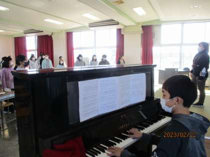 金曜日で祝う会まで残りわずか。卒業式まで15日。縦割り班で準備をしたり、空いた時間に活動したりして準備が進んでいます。また、卒業式に向けて、歌の練習もがんばっています。