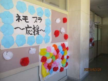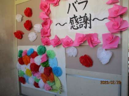 卒業を祝う会で伝えたいメッセージを、掲示にまとめました。花言葉を生かしたいという子供たちのアイディアが形になりました。これらの花は、5年生だけでなくそよかぜ班ごとの卒業を祝う活動でも作った思いのこもった物です。