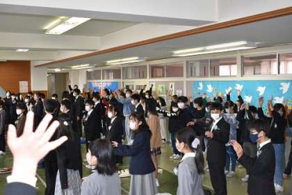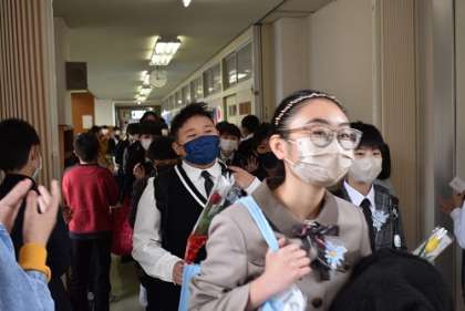 式の後は各学級、そして6年生全員で最後の時間を過ごしました。歓送会では、自治振興会長さんや5年生からエールや万歳三唱をいただきました。退場の花道では、在校生や教職員のみなさんに見送られ、最後のお別れをしました。