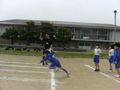 50m走のタイムを計りました。前の記録よりも速く走ろうと、ゴールまで一生懸命走っていました。