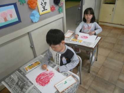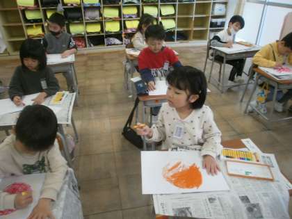 「こんなおひさまがあったらいいな」と想像して、自分なりのおひさまを描きました。にこにこ笑顔のおひさまや楽しそうなおひさまなど様々なおひさまがありました。描いた後、嬉しそうに友達と見せ合う姿がありました。