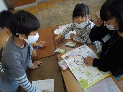 一人一鉢で植えるホウセンカの種を観察しました。その後、「この5つの種は何の種でしょう?」と別の種を提示し、子供たちはグループ毎に予測しながら、種の観察を楽しみました。