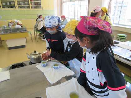 お茶を煎れて飲むことを初めてした子も多かったです。自分たちで煎れたお茶は格別なようで、「あったまるなあ」と言いながら、味わっていました。