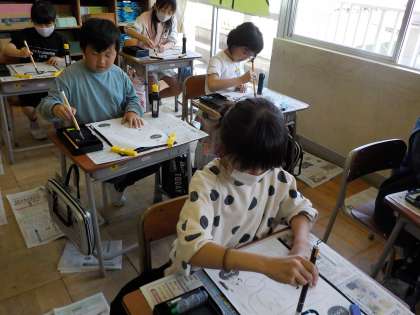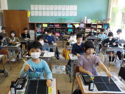 初めての毛筆の学習では、いろいろな線を引いたり、筆圧に気を付けて書いたりしました。これからいろいろな文字に挑戦していきます。