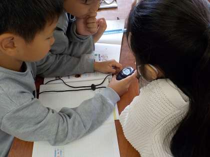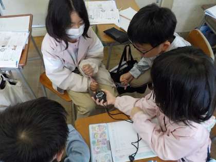 分よりも短い単位「秒」を学習しました。ストップウォッチで60秒計り、1分の長さを体感しました。
