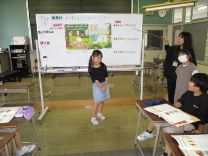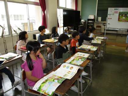 子供たちは元気に歌を歌ったり、リズムに乗っ曲を聴いたりして、音楽の学習に取り組んでいます。「かくれんぼ」の曲の様子を想像して、声の大きさを工夫しながら呼びかけと答えに分かれて歌いました。