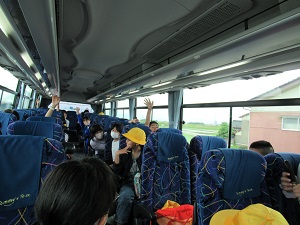 バスの中の様子です。レクリエーション係が中心となって、みんなでクイズや30分の1ゲームなどをしました。約1時間の長い移動時間もあっという間に過ぎていきました。