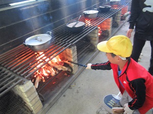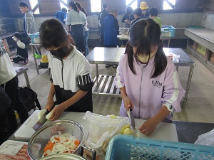 子どもの村に着いてから、早速野外炊飯でカレー作りをしました。班のみんなで協力しながら、野菜を切ったり、火をおこしたりしました。班によって、野菜の切り方や米の水の加減が異なり、食べている時も「自分で作ったカレーはおいしいな」と言って美味しくいただきました。