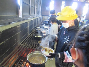 片付けも鍋に付いた汚れを金だわしで、みんなでゴシゴシと擦って汚れを取るなど、協力して後片付けをしました。