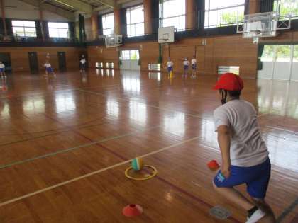 体育のキックベースの様子です。この学習では、攻めるや守るだけではなく、審判や得点板も子供たちで行っています。初めて体育で審判をする子供たちは、セーフかアウトかを判断するためすごく集中して取り組んでいます。技能や思考面でも、日を重ねるごとにキックが上達したり、団で作戦を立て合ったりするなど子供たちの成長を感じます。6月中子供たちがキックベースを通してさらに成長できるように支援していきます。