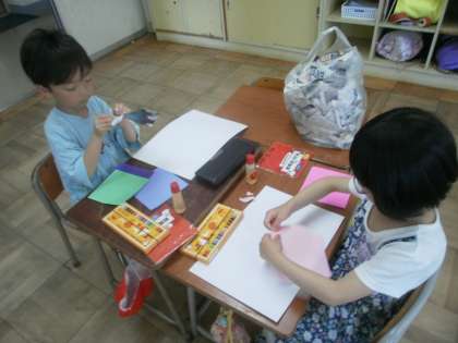 折り紙を好きなように破り、画用紙に貼りました。できた形から何が思い浮かぶか考え、友達に話をしました。「うさぎに見える」「顔に見える」などといった楽しむ声がたくさん聞かれました。