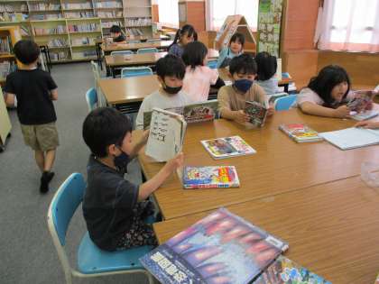 図書室で本を借りました。子供たちは自分たちの興味のある本を楽しそうに借りていました。