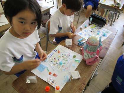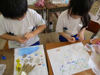 図工科で、持ち寄った材料の形や質感を生かして作品を作りました。作っている間にもどんどんアイディアがあふれてくる様子でした。