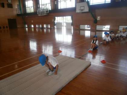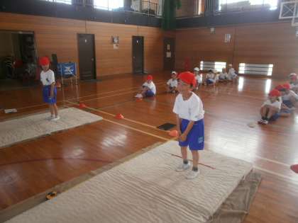 子供たちは、小学校に入って初めてのスポーツテストに挑戦しています。今日は立ち幅跳びをしました。手を振ったり膝を曲げたりしながら、自分の記録を伸ばそうと一生懸命に取り組んでいました。