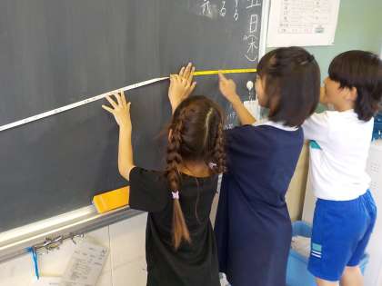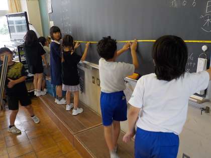 まきじゃくを使って、教室の中にある物の長さを測りました。長い物の長さを簡単に測れる良さに気付いていました。