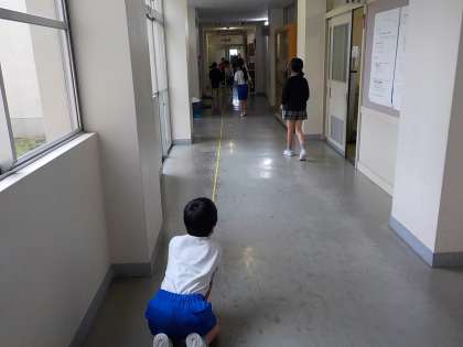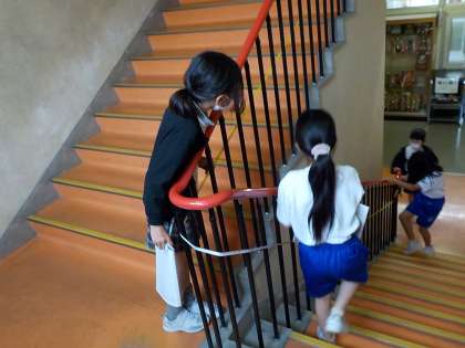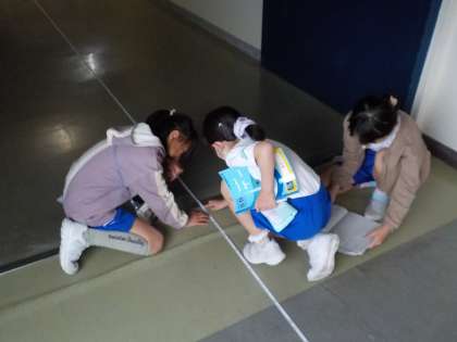 今日の授業では、学校の中にある物の長さを測りました。普段通っている廊下や階段、下足ロッカー等、いろいろな物の長さに興味をもって活動していました。