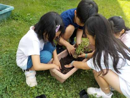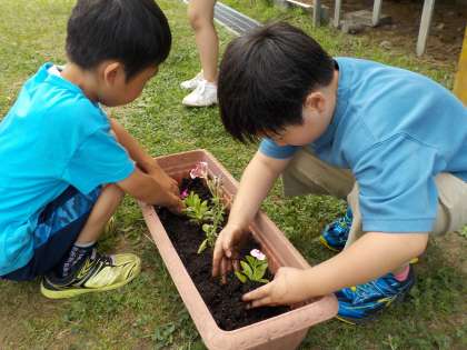 学校を彩る花の苗をプランターに植えました。友達と協力して、土をプランターに入れたり、根が張るように苗を植え込んだりしました。