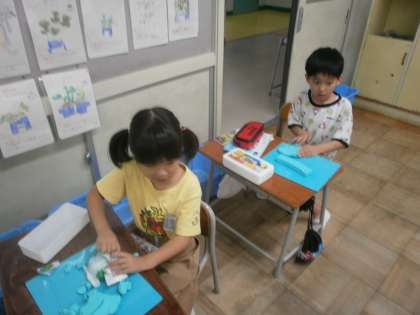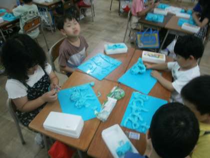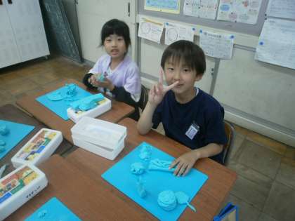 1、2時間目にねんどを使って、いろいろな太さのひもをつくりました。そのひもで、きれいな丸や食べ物等をつくる姿も見られました。2時間目からは班の友達と一緒に作品づくりをしました。素敵なケーキづくり対決などをして、班のみんなとねんどを楽しんでいました。