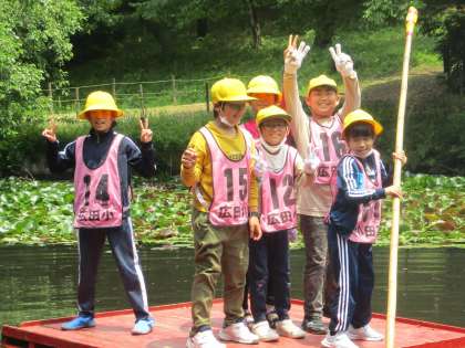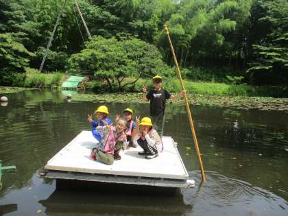 野外活動の様子です。いかだに乗って池の上を移動する、竹のジャングルで竹の上を歩いて遊ぶ、ザリガニ釣りをする、ゴルフやフリスビーをするなど様々な活動をしました。全ての活動を終えて振り返りをしているときに「全部の活動が楽しかった」と呟く子が多かったです。自然の中でしかできないことを通して、子供たち同士で協力し合ったり、笑い合ったりする姿がたくさん見られました。