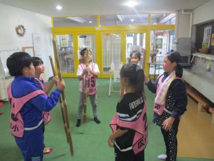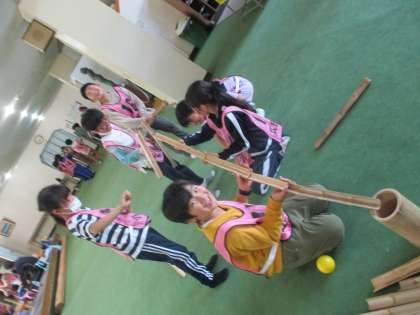 バンブーチャレンジの様子です。竹を使った遊びで 1 竹の切り口を積み上げるバンブータワー 2 オナモミを使い的当てをするバンブースリリングショット 3 竹の棒をリズムに乗りながら受け渡すバンブースティックキャッチ 4 切られた竹で道を作りゴールまでボールを運ぶバンブーラインの4つの活動をしました。活動係が中心となり、それぞれの遊びが楽しくなるように考え、活動に取り組みました。声を掛け合う、集中するなど様々な要素を含んだ遊びを通して、班のみんなで悔しがったり笑い合ったりするなど一丸となって活動に取り組む姿が見られました。