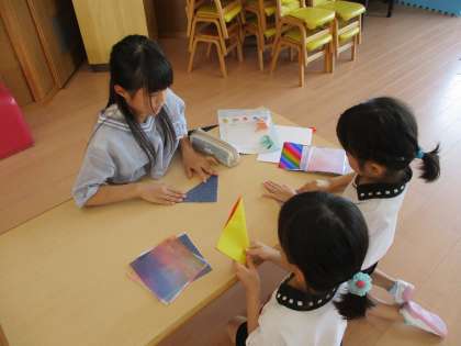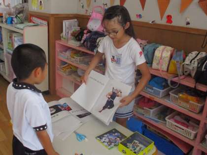総合の学習の様子です。ひろたこども園の子供たちと遊ぼう大作戦!で第二回目の訪問をしました。子供達は前回を振り返り、改良したものや園児の楽しみを改めて考えて一新したもので活動に取り組みました。振り返りでは、自分の作戦に満足したと書いたり、話したりしてくれる子が多かったです。また、「みんながハッピー&スマイル!」について「園児だけでなく、自分も楽しいのがハッピー&スマイルだと思う」「自分の出し物だけでなく、友達の出し物がうまくいったことも自分のハッピー&スマイルにつながった」とワークシートに記入する子がいるなど、1学期の初めでは中々意味を捉えることができなかった「みんながハッピー&スマイル!」も子供一人一人の中で考えをもつことができたと思います。二学期は園児との関わりの中ではないですが、人との関わりから子供たちが学習できるよう支援していきます。