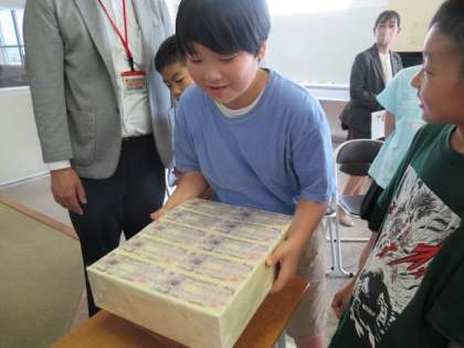 最後には、1億円を手に持ってみる体験もし、子供たちは「重くて持ち上げられない」や「1億円ってこれくらいの量になるんだ」と様々な反応をしていました。