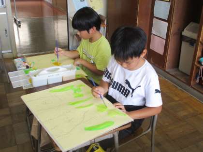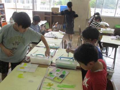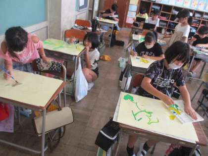 図工の学習の様子です。「ヘチマアスレチック」の色塗りをしました。日光の当たり方を意識して色を変化させたり、ヘチマの実を描くときに塗る方向を考えたりするなど工夫していました。