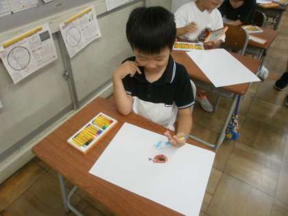 国語科で学んだ「おおきなかぶ」や「おむすびころりん」のお話で、自分の好きな場面をクレヨンを使って描き表しました。「おじいさんってどんな髪色かな」「人の顔を描くのって難しい」「絵を描くのが楽しい、もっとしたい」といった声がたくさん聞こえてきました。